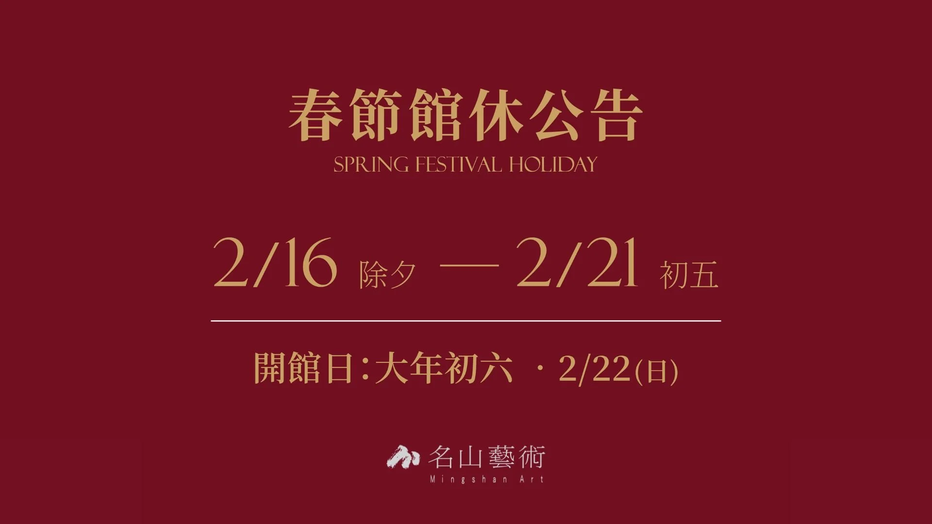 名山藝術春節休館時間為2月16日至2月21日,我們將於2月22日開工。