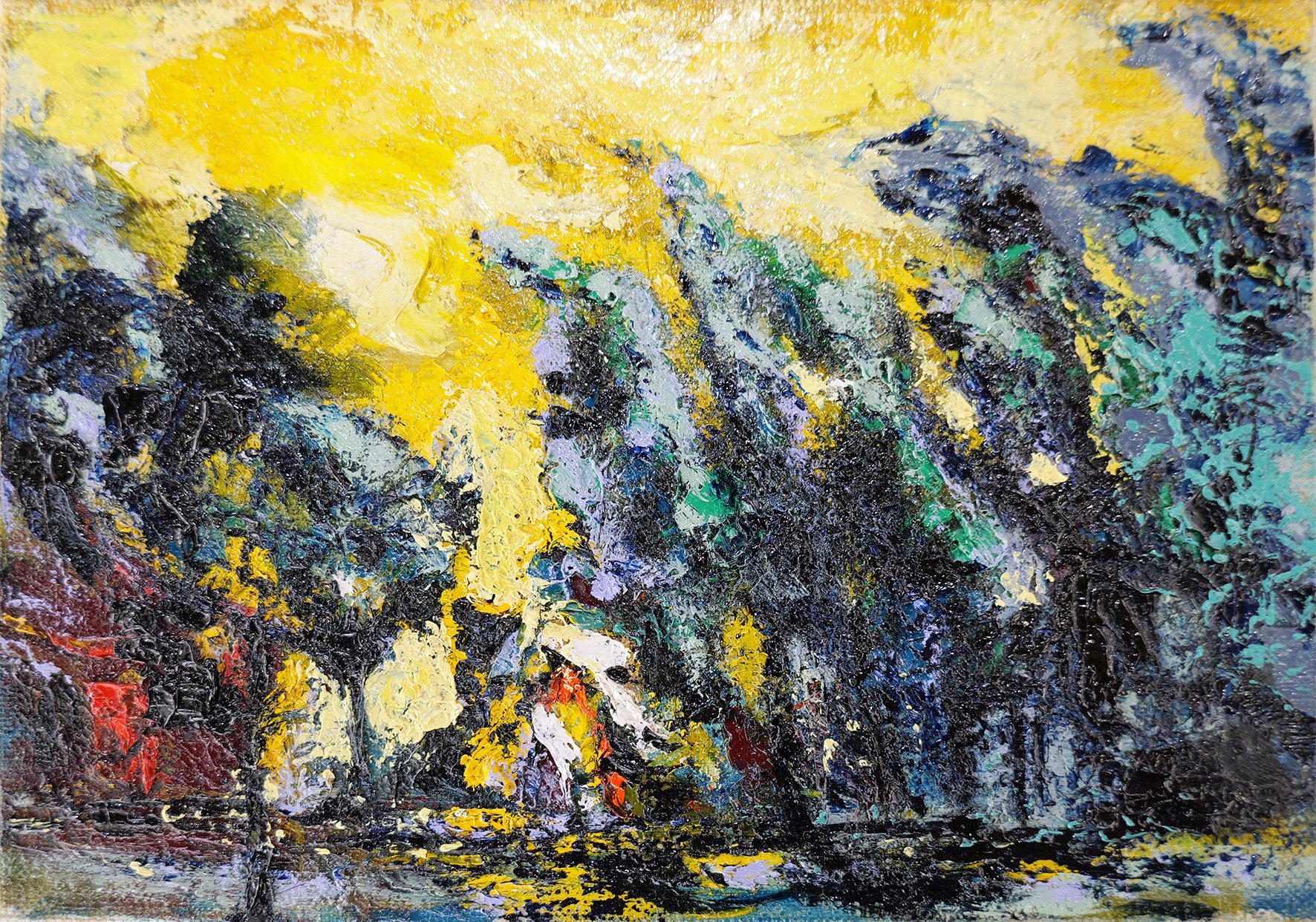 Drawing inspiration from nature, Cheng Chung-Chuan favored vivid, contrasting colors. Her work is bold and free-spirited, brimming with vitality. Dominant hues in her paintings include the vibrant yellow of life, the liberating blue, the fiery red, the opulent gold, and the mysterious yet elegant black. Her artwork exudes a robust life force, with each piece symbolizing a resilient will to survive in adversity. Her vibrant palette conveys a release of repressed passion—her bold reds, yellows, blacks, and golds resemble flames, whirlpools, flowing clouds, and surging water, all pulsating with dynamic energy.