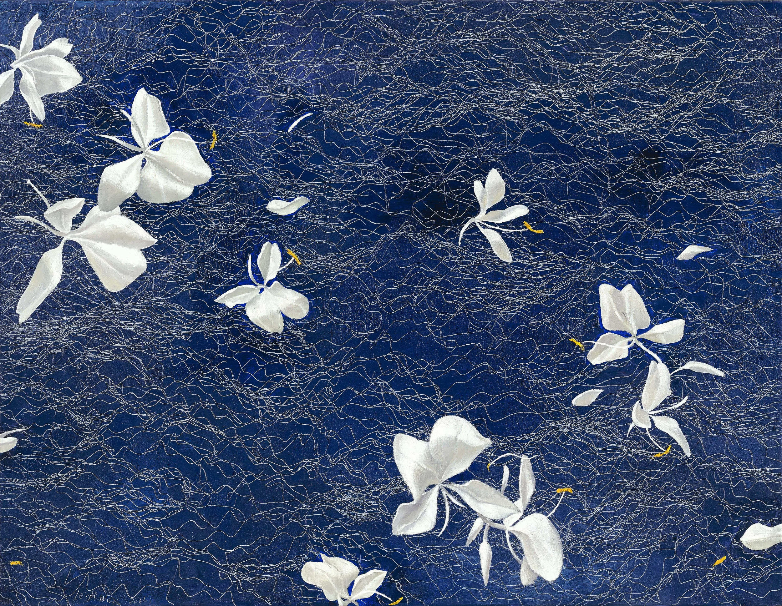 最近2016年7月才看到的《野薑花系列》:雖然和前面作品有高度連續性,但是在清澈、清涼、純淨的山泉水中飛舞旋轉的野薑花散發著清新、潔淨、脫俗、愉悅,幸福的感覺,甚至能夠感受得到圓舞曲的旋律與節奏,以及擬人的花朵間的互動關係。