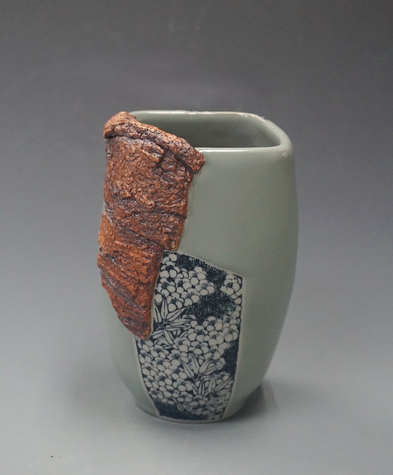 透過對泥土質地、特色的深刻了解,寫意地呈現自然樣貌。撕土的粗獷肌理如嶙峋山石,青瓷的溫潤幽靜喻作一泓碧綠湖水,高溫燒製的大地裂紋延展出無盡情感。以肌理和釉面的對比,詮釋對大地的虔誠與關懷,以陶藝將自然與人文氣息做了最美的融合。