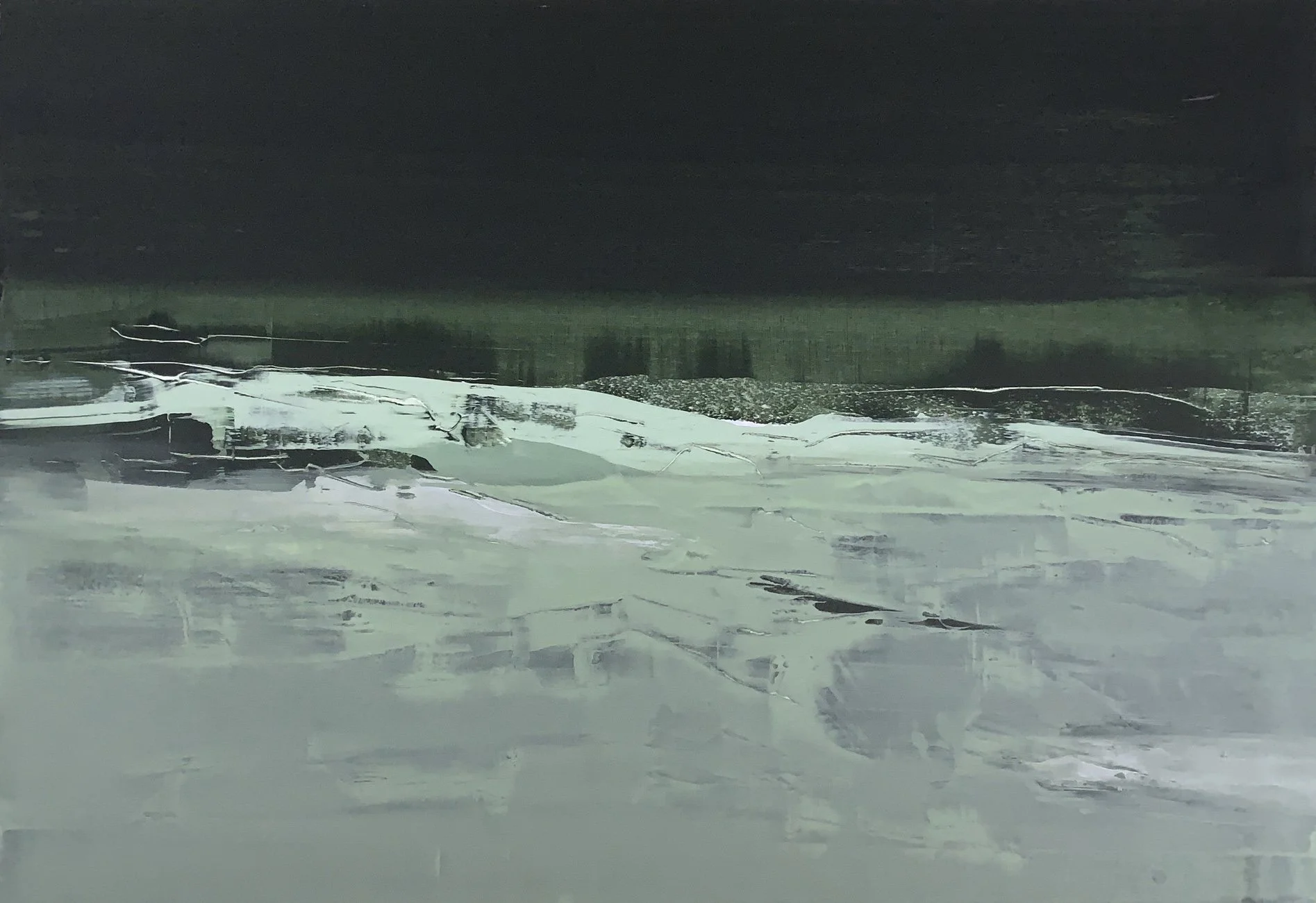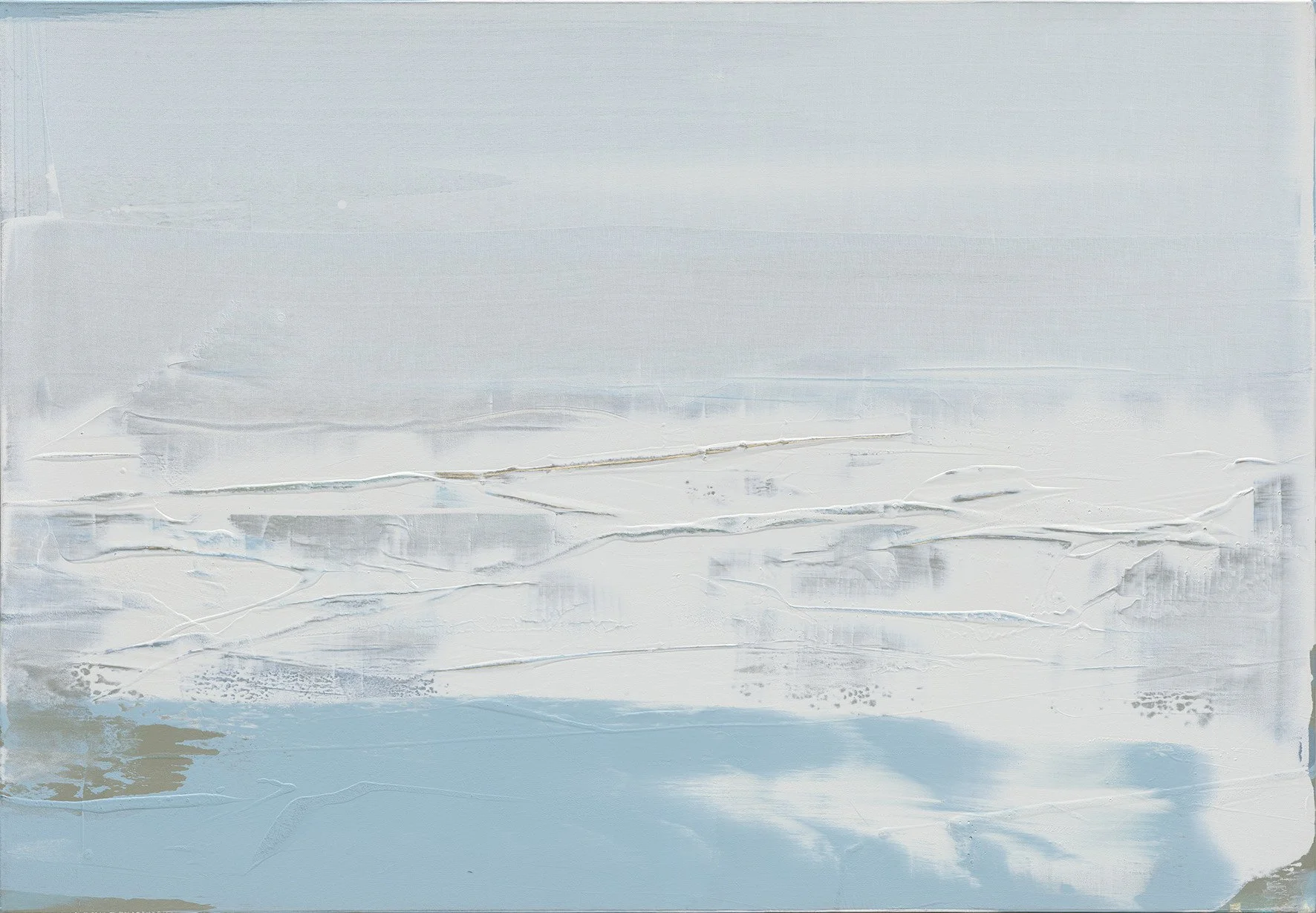 李佳駿的創作核心源於自然風景與元素,以西方抽象的繪畫形式,體現東方悠遠玄逸的美學特性。刀具拖曳後形成的山石般肌理、低彩度色域的輕盈表現,李佳駿以蘊含水墨氣韻的抽象表現回應風景。運用留白與光感,營造介於現實與心象之間的空間,虛實之間有雲霧風霜、似廣邈天地,風景轉化為心理意象與沉思的載體。