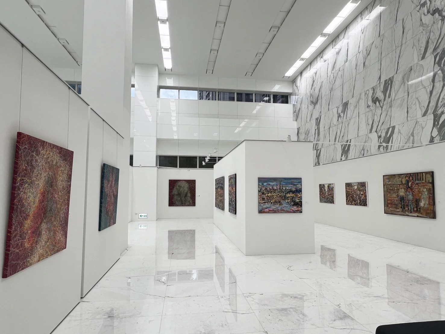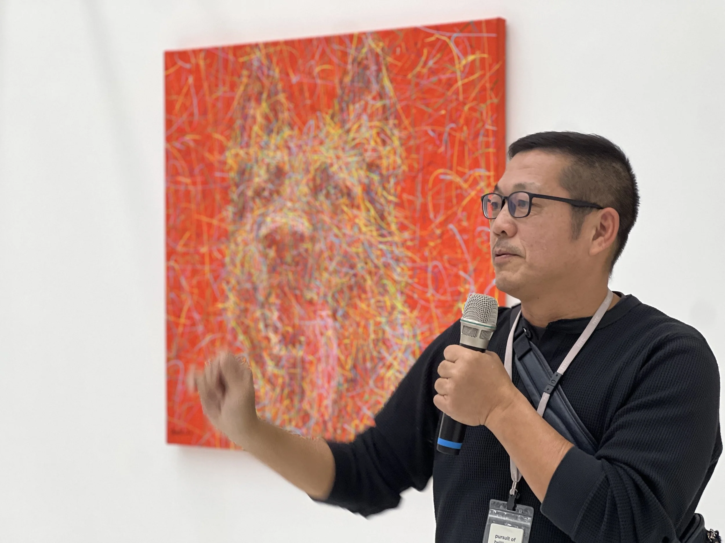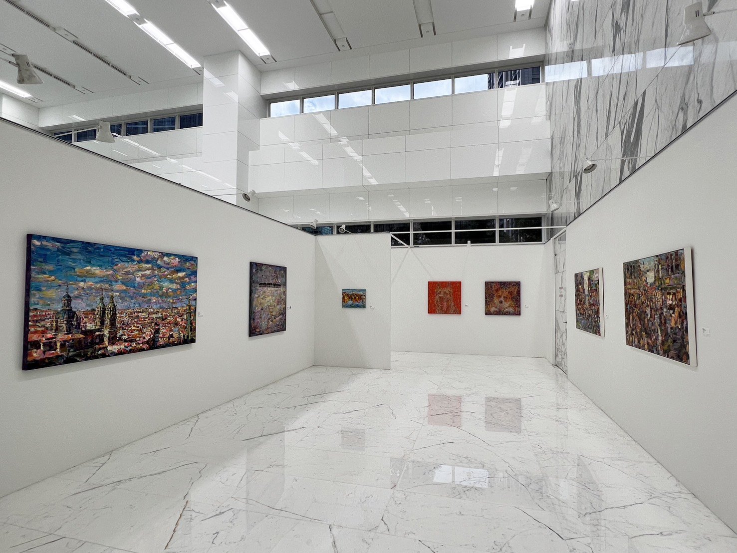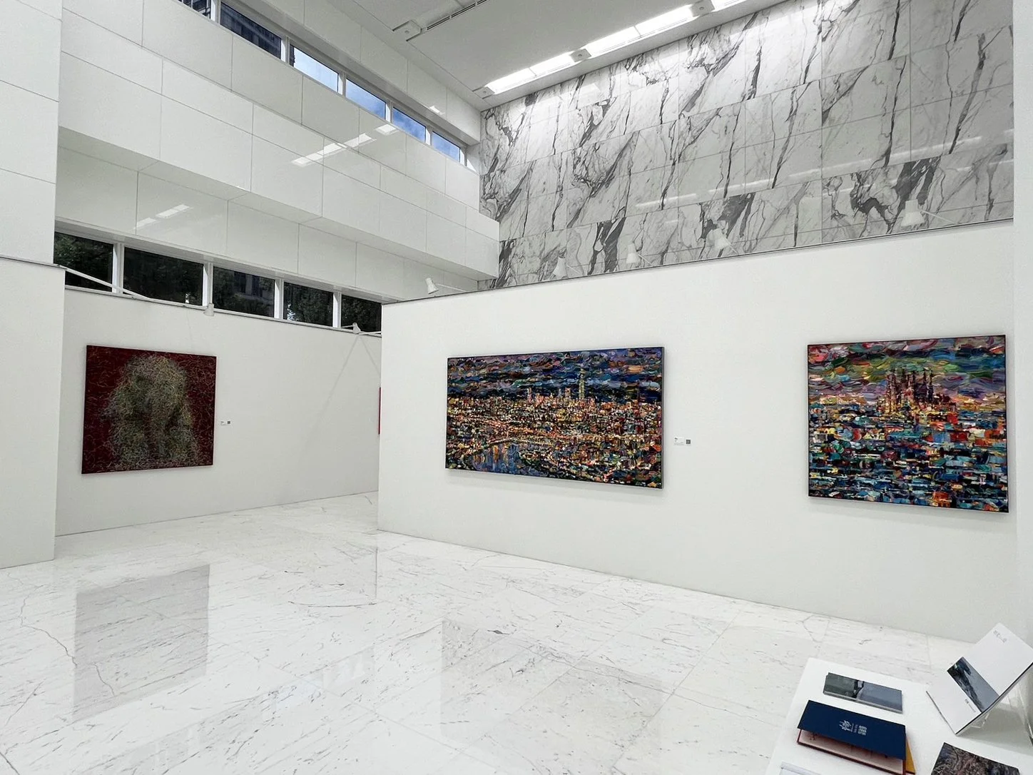 翁明哲獨有的「畫刀美學」與「壓克力甩畫」將顏料化為身體肌肉延續,於色塊起伏交織、線段蜿蜒間,堆疊形塑出洋溢鮮明性格與充滿溫度的街市與旅程風景,將自我流竄在動靜共存的璀璨風景間,使風景帶有生命脈動。